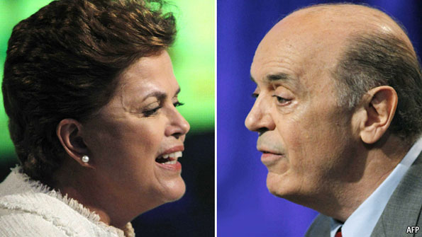 The Economist’s endorsement of (eventual loser) Mr. Serra in the Presidential election highlights some issues worth watching in the new Rousseff administration. “Mr Serra also has faults, notably a worrying tendency to try to micromanage everything. But his record suggests that he would move faster to cut wasteful spending and eliminate the fiscal deficit, and that he would be keener to mobilise private capital for much-needed infrastructure. Monetary policy would no longer have to carry all the burden of keeping inflation under control, allowing Brazil’s egregiously high interest rates to fall (and helping to halt the excessive appreciation of the real). Ms Rousseff would tackle such distortions more gradually, if at all. In an uncertain world that is unnecessarily risky. For all his achievements in fighting poverty and making Brazil a fairer place, Lula is bequeathing a country where one in two homes lack mains sewerage and educational standards remain woeful. Those should be priorities for public spending. There are two other reasons why Brazilians would do well to favour Mr Serra. The first is that Ms Rousseff is not Lula. She lacks his extraordinary political gifts and perhaps also his innate pragmatism. By contrast, although Mr Serra may be a poor campaigner, he has been an effective minister, mayor and governor. Second, although no political party has a monopoly when it comes to corruption, there are plenty of signs that the PT has become too cosy with power. After eight years under the PT Brazil would benefit from a change at the top.” This is part of my survey of the 30 best articles from The Economist over the past two years to gain insight into whether Brazilian attitudes towards America have declined, and global attitudes towards Brazil — comments welcome!