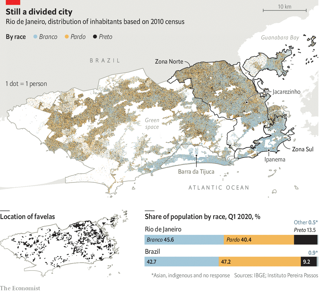 When the shooting stopped, Ms de Paula began her commute down alleyways that zigzag to the bottom of the morro, through a tunnel from Rio’s poor Zona Norte to the rich Zona Sul, and finally to Barra da Tijuca, a beachside strip that is 72% white. In mostly white neighbourhoods in Rio flats can cost 2,000 reais ($400) per square foot. Their inhabitants blame poverty and corruption for the violence that plagues the city. But a growing chorus from Ms de Paula’s Rio, the mostly black peripheries and favelas, suggests there is more to it than that.